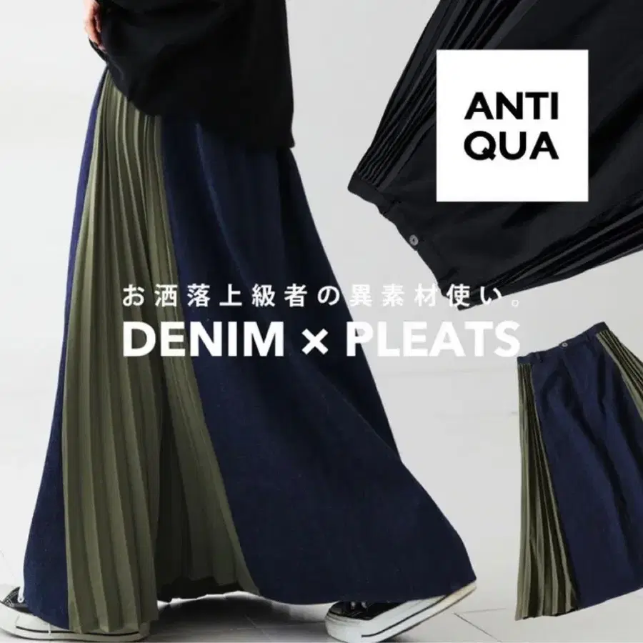 [새상품] antiqua 이소재 데님 도킹 플리츠 롱 스커트
