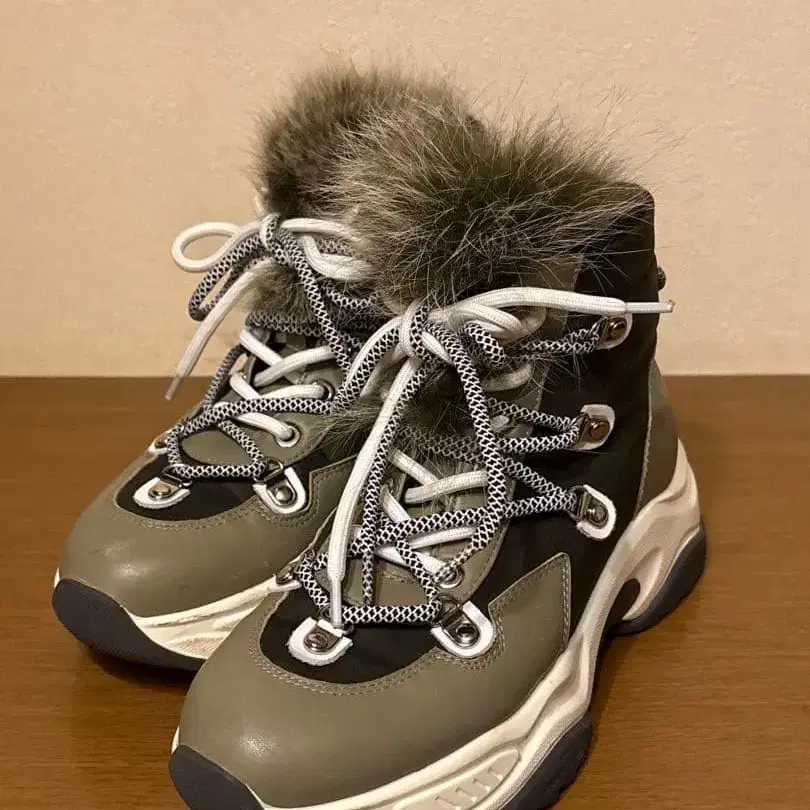천연 가죽 볼륨 밑창 스니커즈 부츠 퍼 포함 카키 23