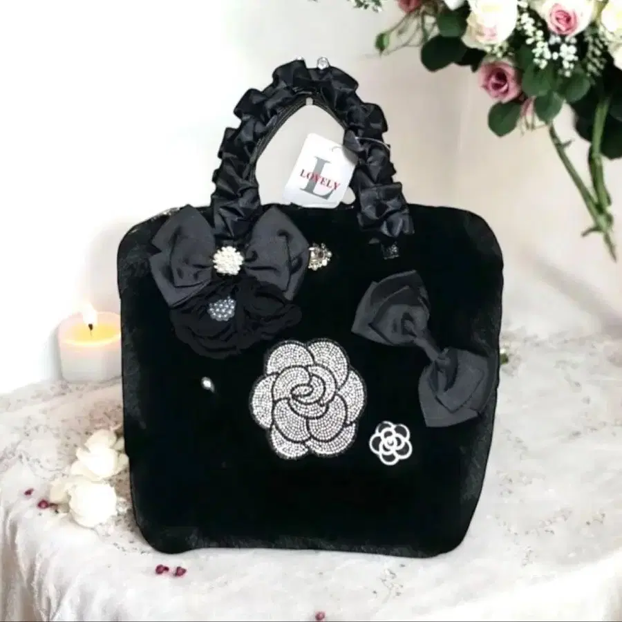 귀여운 퍼 토트백 그레이 까멜리아 리본 꽃 퍼백 새상품