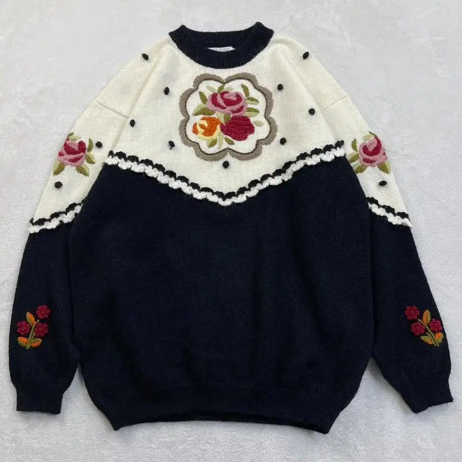 빈티지 플라워 자수 니트 스웨터 화이트 블랙