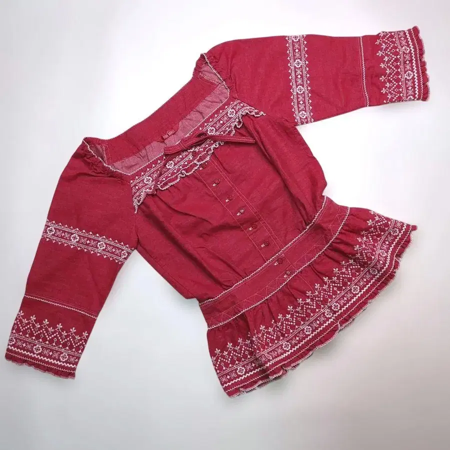 핑크하우스 빨간색 데님 5부 소매 자수 블라우스
