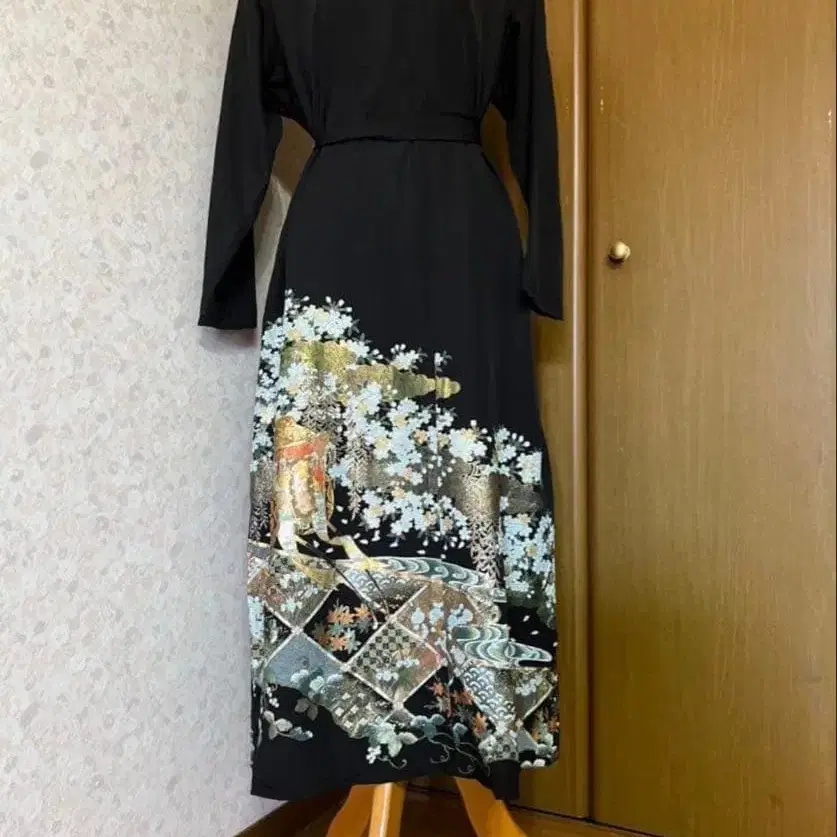 기모노 블랙 꽃무늬 자수 롱 원피스 M~L 사이즈