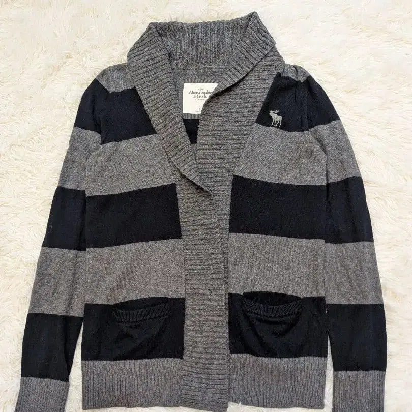 스트라이프 디자인의 그레이와 블랙 가디건, 엠블럼이 달린 앞면 포켓 있음.