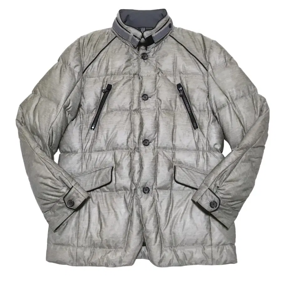 특징: 약간 브론즈가 감도는 실버 색상의 겉감은 너무 화려하지 않으면서 차분한 고급스러움을 선사합니다. 각도에 따라 표정이 변하는 멜란지 느낌의 질감이 성숙한 여유를 연출합니다. 곳곳에 배치된 인조 가죽 파이핑이 디자인을 잡아주어 도시적이고 샤프한 인상을 줍니다. 옷깃을 세워 착용할 수 있는 스탠드 카라 (마오 칼라 타입) 사양입니다. 턱 스트랩 벨트가 있어 방한성을 높이는 동시에 클래식한 멋을 즐길 수 있습니다. 앞면은 집업과 4개의 단추식 여밈을 병용합니다. 바람의 침입을 철저히 차단하면서도 버튼의 디자인으로 스타일링을 조절할 수 있습니다. 외부: 복부 좌우에는 플랩이 달린 스냅 버튼 여밈 포켓이 있습니다. 내부: 양쪽 가슴에 기능적인 세로 지퍼 포켓이 있어 스마트폰이나 귀중품 수납에 최적입니다. 소매 끝은 스트랩 버튼 여밈으로 조절 가능합니다. 뒷면에는 허리 라인을 잡아주는 조절 벨트가 있어 다운 특유의 부피감을 억제한 아름다운 실루엣을 만들 수 있습니다. 어반 무드가 넘치는 아름다운 디자인의 도시적인 다운 자켓입니다!