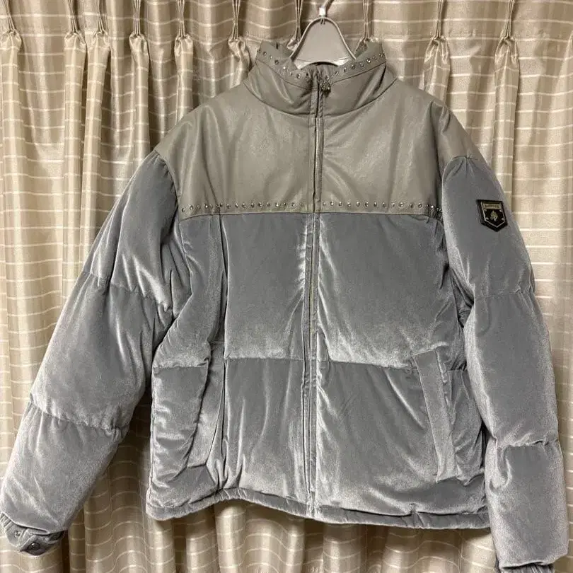 자동 번역되었어요. 원문보기스터드가 달린 그레이 벨로아 다운 자켓, XXL 사이즈입니다.