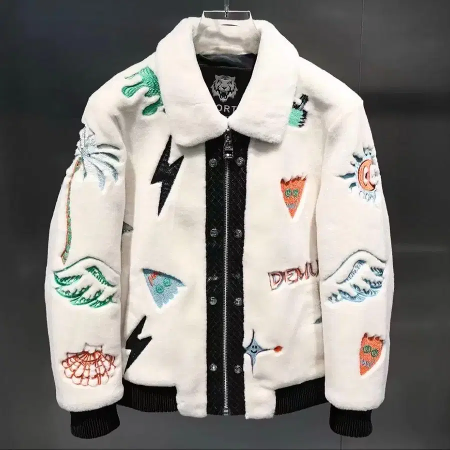 자수 장식 화이트 플리스 바시티 자켓