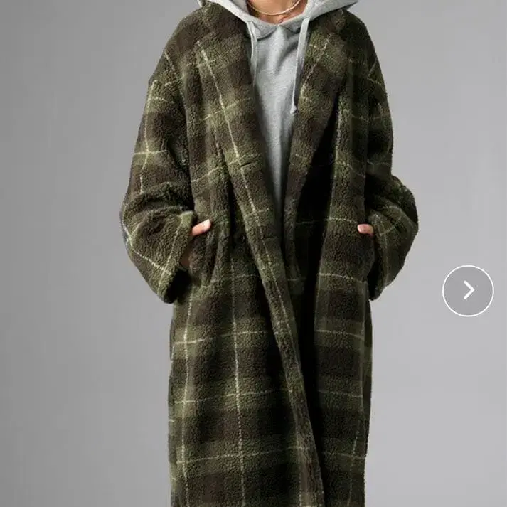 포근한 질감과 둥근 실루엣이 매력적인 체크 무늬 롱 기장 보아 자켓입니다.