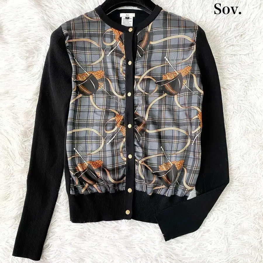 오리지널 새틴 프린트 x 니트탑 가디건 승마 모자 스카프 패턴 이소재 도킹 거의 미사용