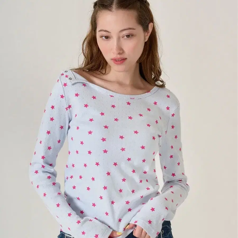 [ TINA:JOJUN ] 숄더 열림 스타 프린트 롱T