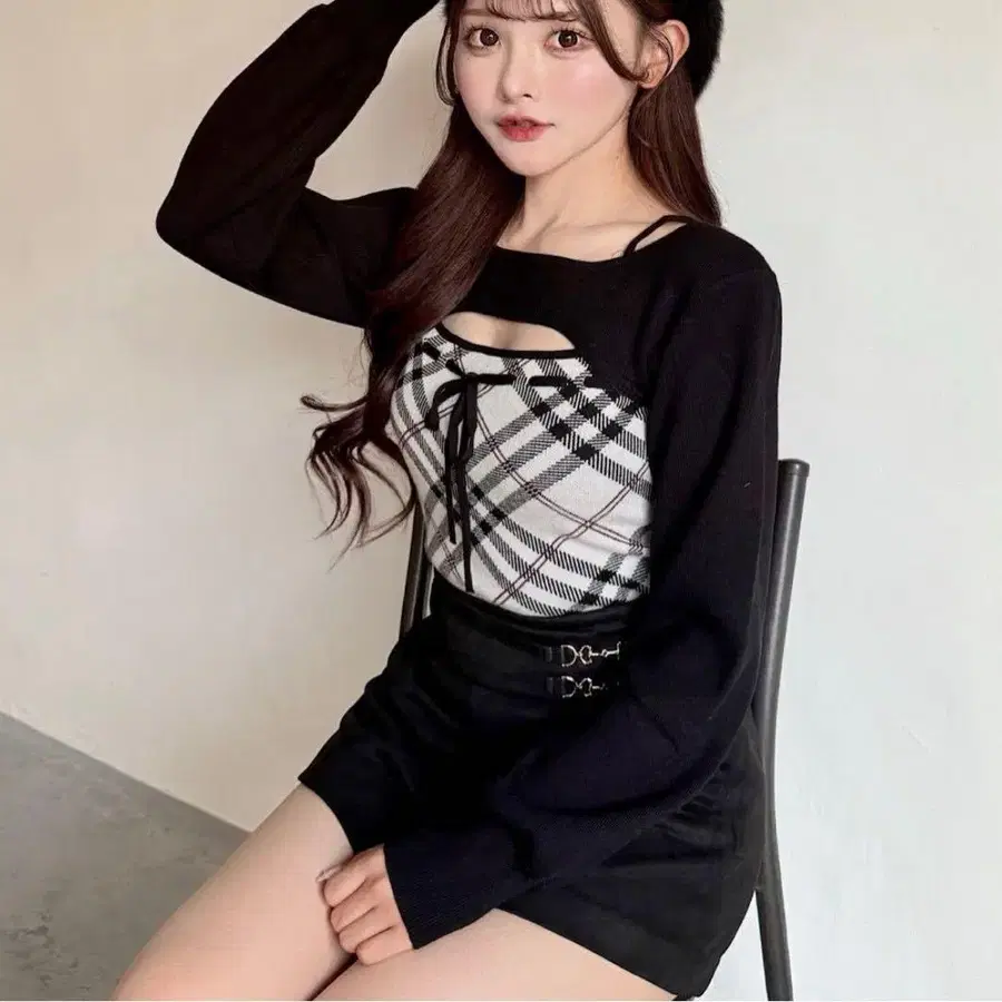 NOMAE 체크 리본 숏 레이어드 니트 상의