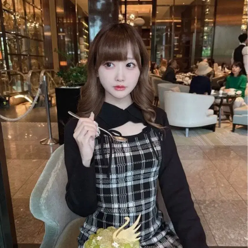 grl 체크 무늬 프론트 오픈 리본 니트 미니 원피스