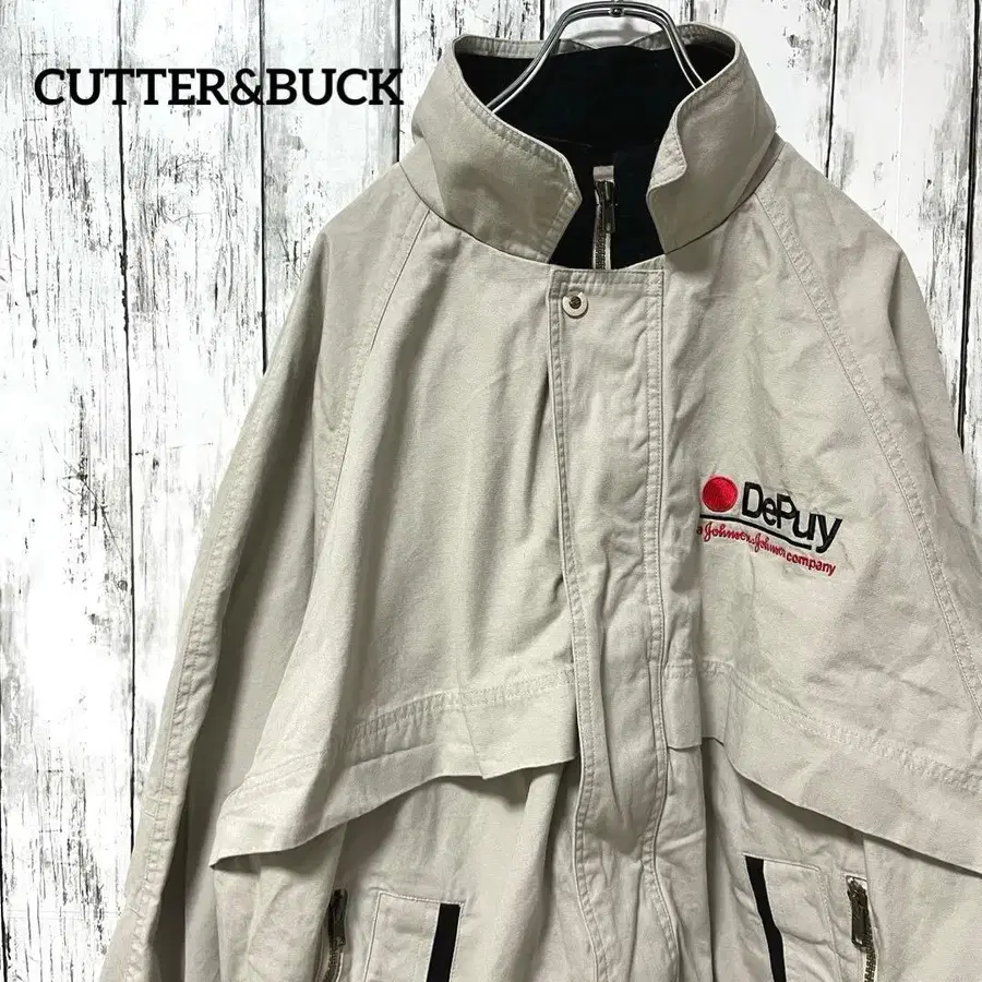 집업 베이지 점퍼, 스탠드 카라와 지퍼 포켓 부착.