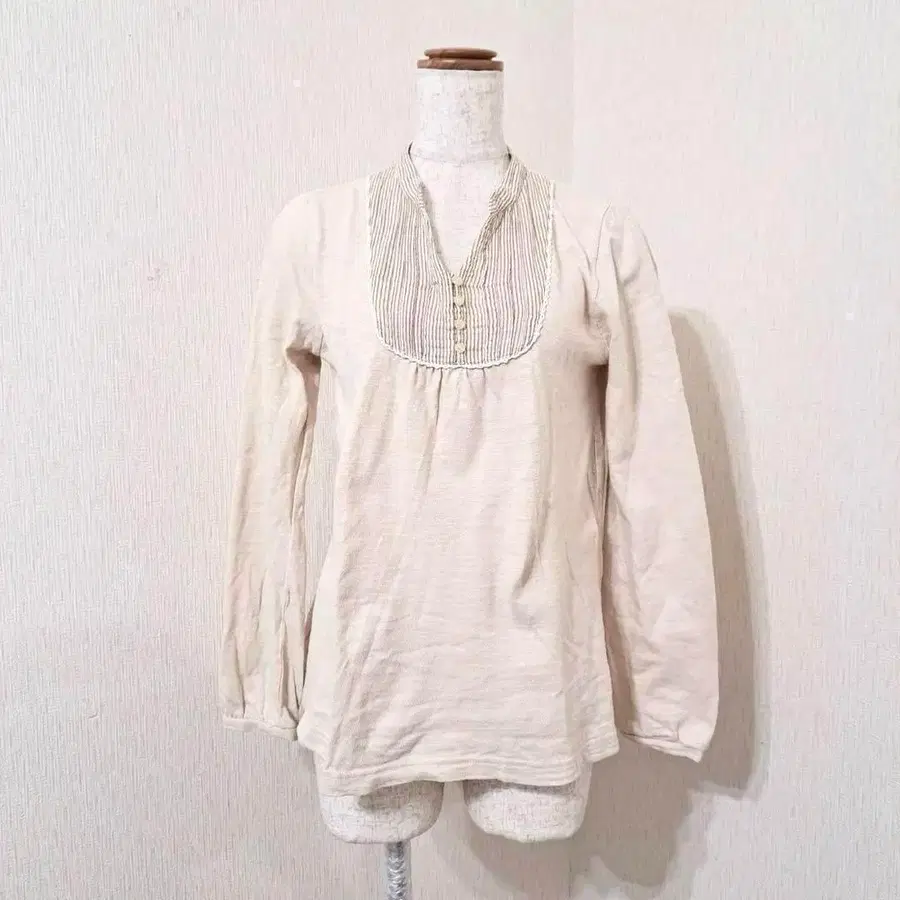 내추럴한 질감이 매력적인 코튼 100% 상의. 가슴 부분에는 스트라이프와 버튼 악센트가 있어, 은은한 클래식함을 연출. 포근한 착용감으로 캐주얼에도 페미닌에도 활용 가능한 아이템입니다.