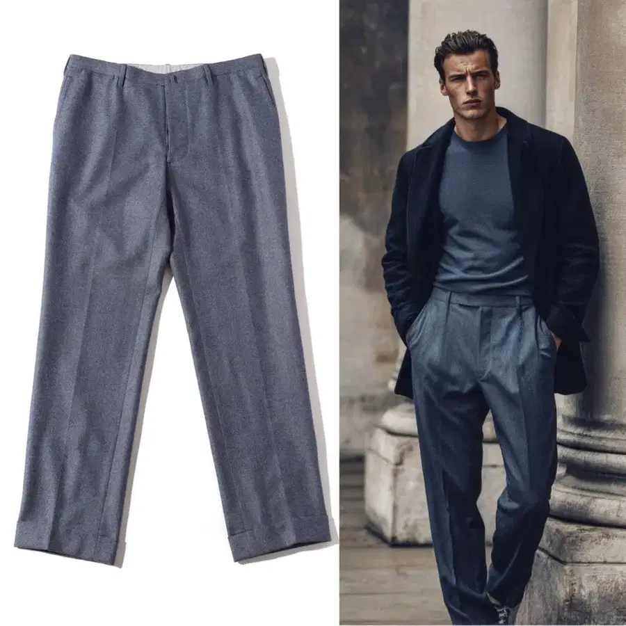 C1391 실력파 사르토리아 ◎ Sartoria Ciccio 사르토리아 치치오 새상품급 트라우저 팬츠 슬랙스 울 부드러운 더블 마감 버튼 플라이 가을/겨울 블루 그레이 XL 상당!