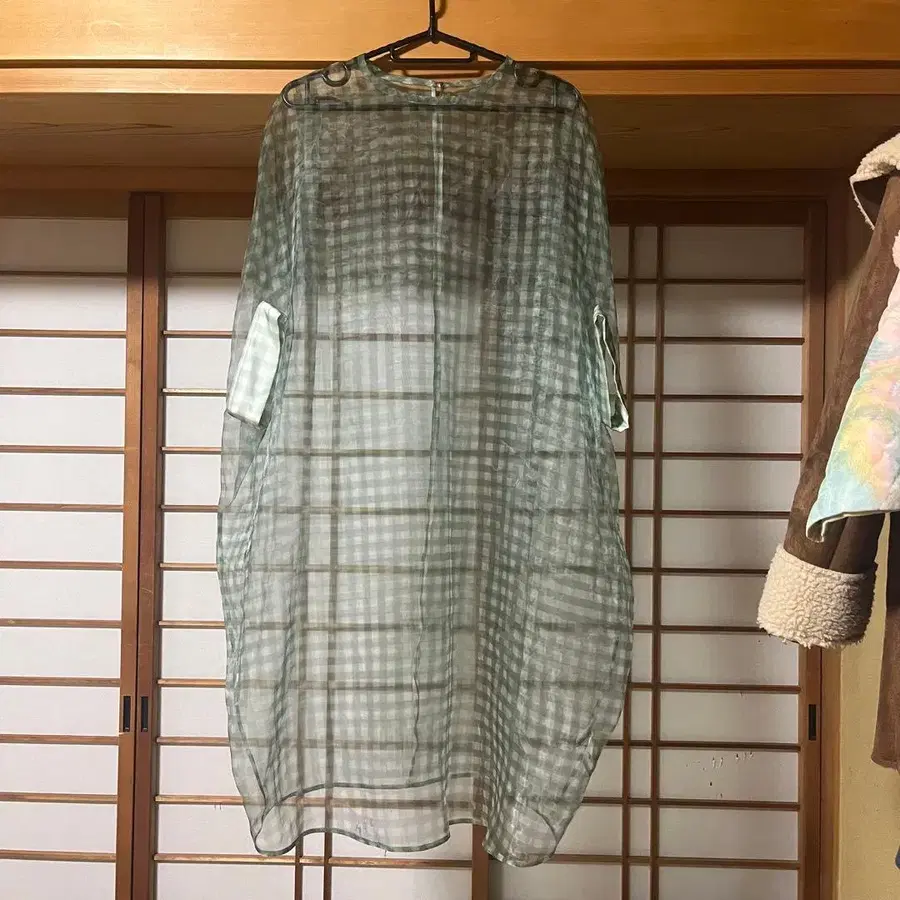TARO HORIUCHI 그린 계열 체크 반팔 시어 원피스