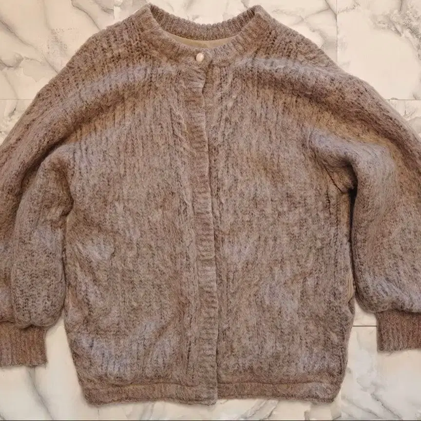 털이 긴 복슬복슬한 모헤어 혼방 소재가 매우 사랑스럽고, 볼륨감 있는 소매 실루엣이 아메리다운 한 벌입니다.