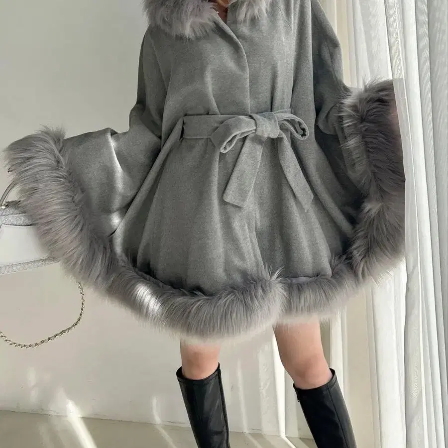 로얄 파티 후드 퍼 케이프 코트 그레이