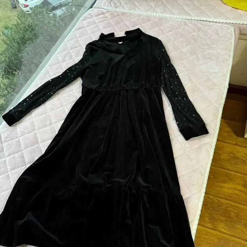 블랙 벨벳 긴팔 원피스