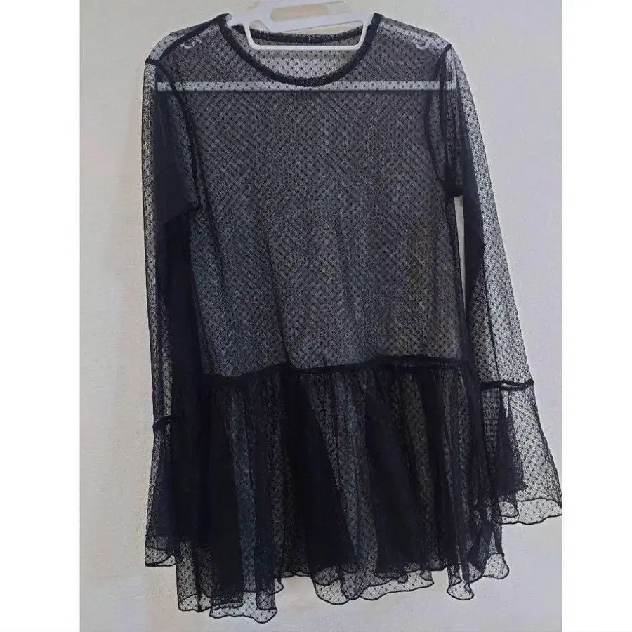 섬세한 도트 튤 소재가 만들어내는 비침과 입체적인 표현이 매력적인 튜닉 기장.