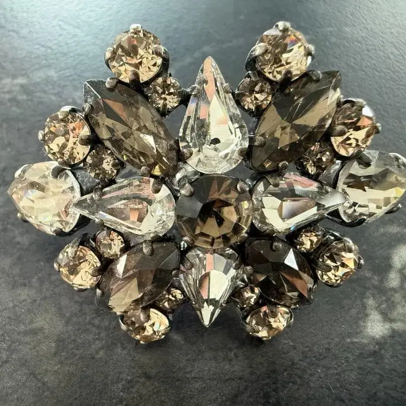 FOXEY 의류 등에 부속된 브로치로 보입니다. 대형 스톤 사용으로 고급스러움이 있습니다. 핑 브로치이므로 퍼나 볼륨감 있는 소재에도 사용하기 좋습니다. 라이트 브라운 계열 x 그레이 계열로 시크하고 모던한 인상입니다. 폭시 의류에 잘 어울리는 디자인으로 고급스러움을 더합니다. 오래 사용할 수 있고 패션에 맞추기 쉬운 것도 포인트입니다.