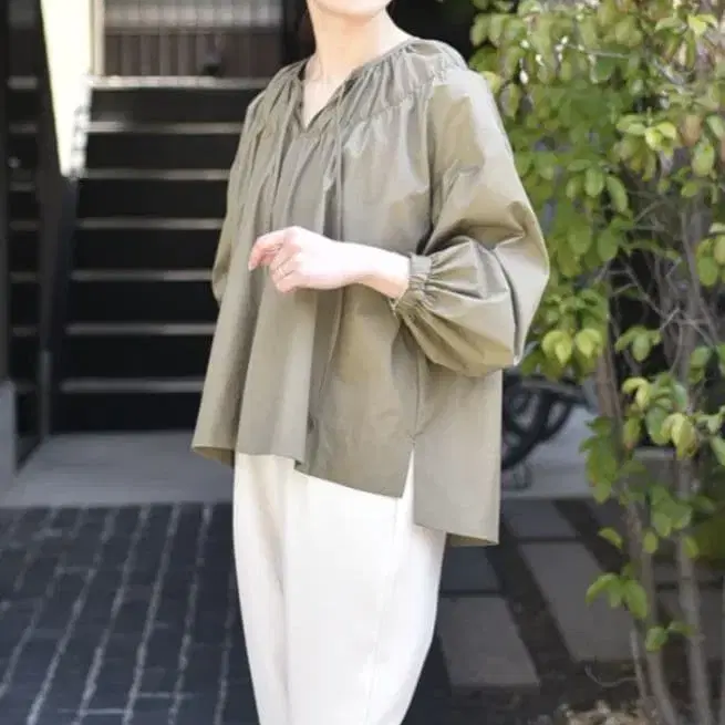 OURHOME 풍성한 개더 플레어 블라우스 올리브