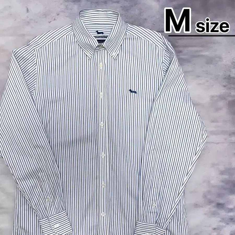 USA 구제 의류 긴팔 셔츠 M 스트라이프 화이트 블루 닥스훈트 자수