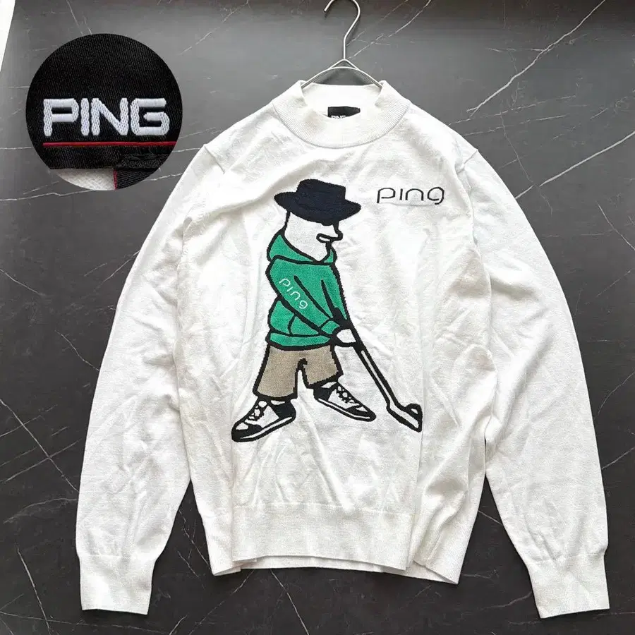 PING 골프 니트 스웨터 남성용 LL 화이트 자수 디자인 Mr.PING 로고 미스터 핑