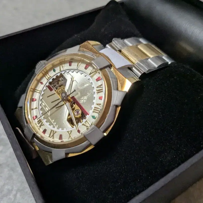 구매 후 실제 착용은 하지 않았으나, 한 번이라도 사람의 손을 거친 물건임을 이해하신 후 구매를 부탁드립니다. 상태는 이미지를 확인해 주세요. 보호용 비닐은 부착되어 있습니다. 눈부시게 빛나며 압도적인 존재감을 뿜어내는 [제기 마그나 팔레스]를 손목시계 전체로 표현한 한 점. 인덱스 주변에는 기체 머리 부품을 이미지화한 레드와 그린의 장식을 배치했습니다. 마치 마그나 팔레스의 내부를 들여다보는 듯한 오픈 하트 사양입니다. 오픈 하트 하단에는 아마테라스 왕조, 그리고 A.K.D.의 기사로서 [제기 마그나 팔레스]를 상징하는 미라지 기사단의 문장을 새겼습니다. 시시각각 시간을 새기는 초침은 갓 브로우를 본떠, 적을 베어 넘기는 [제기 마그나 팔레스]의 모습을 연상시킵니다. 시스루 백 뒷면 커버에는 레디오스 소프와 라키시스의 실루엣을 프린트하여, [더 나이트 오브 골드]를 등진 두 사람의 모습을 떠올리게 하는 마감입니다. 끊임없이 이어져 시공을 초월한 아름다움을 지닌 GTM [제기 마그나 팔레스]의 매력의 일단을 접할 수 있는 한 점입니다. ※ 뒷면 커버에 들어가는 패턴의 방향은 정 위치가 아니며 개체 차이가 있습니다. 미리 양해 부탁드립니다. ※ 자동 감기 기계식 손목시계는 운동량에 따라 시간이 멈추거나 늦어질 수 있습니다. ※ 시계 수선, 불량, 배터리 교체, 사이즈 조절에 관해서는 제조사 대응이 됩니다. 아래 이메일 주소로 주식회사 우에니 무역 [우에니 무역 시계 서비스 센터]까지 문의해 주십시오. ueni-after@ueni.co.jp 원산국 / 중국 소재 / 케이스, 류즈, 버클, 벨트: 스테인리스 스틸 다이얼, 바늘: 놋쇠 방품, 뒷면 커버: 미네랄 유리 기계: G2666ZH (중국산) FSS 골드 컬러와 은색의 콤비네이션 손목시계, 로마 숫자 인덱스가 있어 스타일리시합니다. - 모델: 골드 컬러와 은색의 콤비네이션 손목시계 - 디자인: 로마 숫자 인덱스 포함 - 밴딩 소재: 스테인리스 스틸 - 케이스 소재: 금속제 - 부속품: 오리지널 박스 포함 방문해 주셔서 감사합니다.