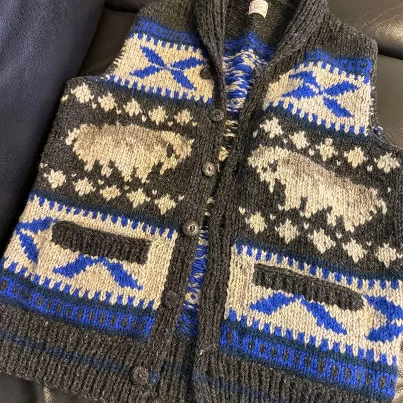 URBAN RESEARCH의 니트 베스트입니다. 네이티브 무늬 (버팔로/기하학 패턴)가 인상적인, 큼직한 손뜨개질 느낌의 니트 베스트입니다. 가을/겨울 레이어드에 사용하기 좋으며, 셔츠나 맨투맨 위에 겉옷처럼 걸치기만 해도 분위기가 납니다. 아주 오래전에 구매했지만 거의 착용하지 않고 옷장에서 보관했습니다. 눈에 띄는 얼룩이나 데미지는 없지만, 소재 특성상 약간의 보풀은 있습니다 (사진을 확인해주세요). 사이즈 표기: 38 ※ 개인 측정으로 인한 약간의 오차는 양해 부탁드립니다. • 기장: 약 63cm • 가슴 너비: 약 52cm 소재 울 83% 폴리에스테르 11% 나일론 6% • 브랜드: URBAN RESEARCH • 생산국: 네팔제 • 프론트 오픈 버튼, 포켓 부착 • 상태: 새상품급 (자택 보관품) 중고품 자택 보관에 이해가 있는 분만 구매 부탁드립니다. 접어서 발송합니다. #URBANRESEARCH #니트베스트 #네이티브무늬 #울니트 #가을겨울