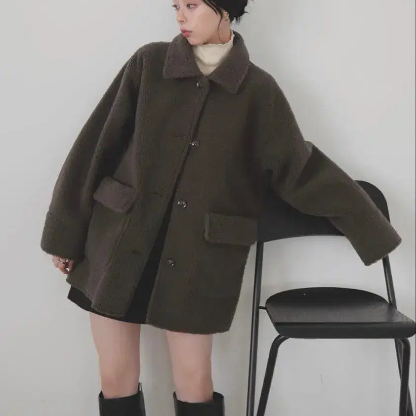 LIAN 보아 무스탕 스텐카라 코트 차콜 그레이