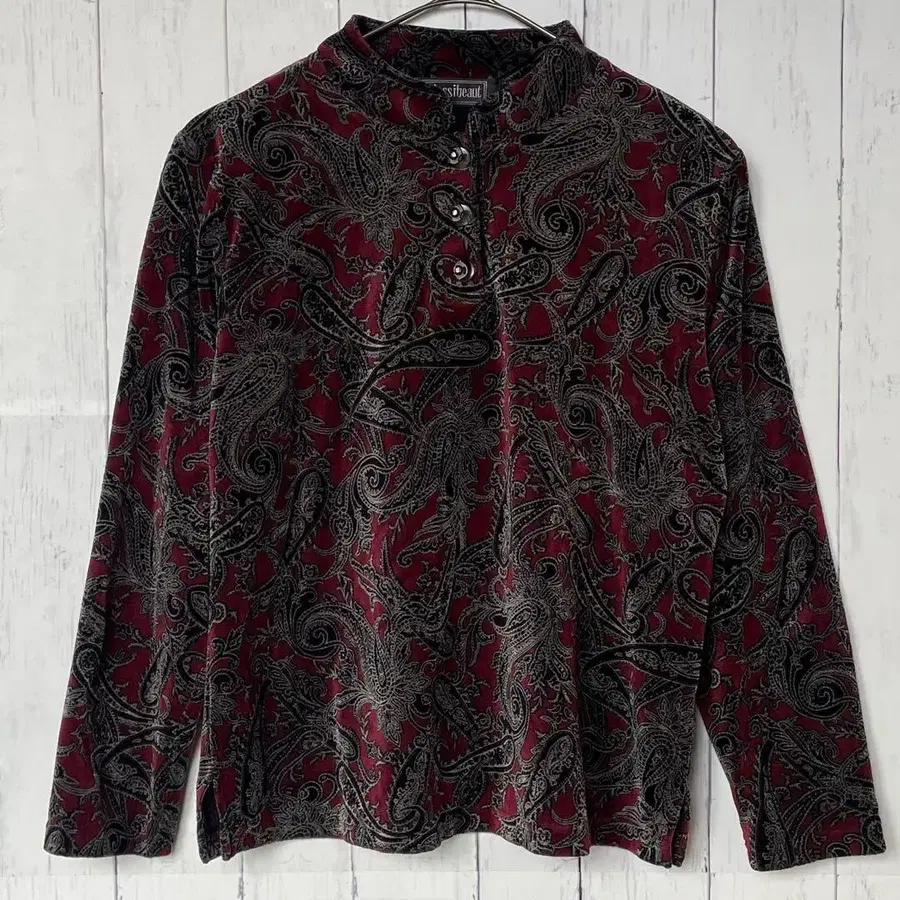 트렌디한 페이즐리 올 패턴 디자인에, 목 부분은 깔끔한 하프 버튼 디자인입니다.