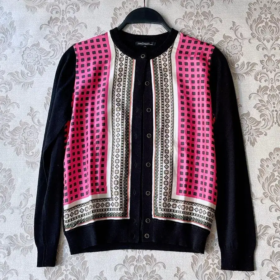 23구 긴팔 가디건 블랙 검정에 비치는 예쁜 핑크색 발색 ♡ 전면부는 실크, 부드러운 촉감도 좋은 가디건입니다. 니트는 부드러운 울 100%입니다. 스커트뿐만 아니라 데님에도 잘 어울렸습니다. 사이즈 38 기장 약 53cm 가슴 너비 약 46cm 어깨 너비 약 36cm 소매 길이 약 56cm 평평하게 놓았을 때 치수 측정, 약간의 오차는 양해 부탁드립니다. 2번 정도 착용. 얼룩, 색바램 등 특별히 언급할 만한 데미지는 없지만, 실크에 옅은 실밥 뜯김이 보입니다. 눈에 잘 띄지 않지만 사진으로 확인 부탁드립니다(ᴗ͈ˬᴗ͈)⁾⁾ 꼼꼼한 검품을 하고 있지만 자택 보관품이므로 미세한 점에 대해서는 양해 부탁드립니다(^^) 유즈드 의류에 이해가 있는 분께 ♡ 기하학 패턴의 핑크와 블랙 긴팔 가디건. - 색상: 핑크와 블랙 디자인 - 스타일: 긴팔 가디건 - 장식: 기하학 패턴과 스트라이프 - 버튼: 전면 버튼 여밈