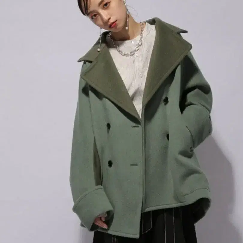 올리브 그린과 큰 옷깃이 귀여운 와이드 실루엣 코트입니다!