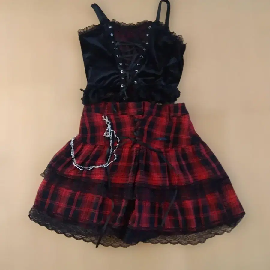 미사미사 코디 블랙/레드 체크 무늬 미니 스커트 벨트&초커 포함