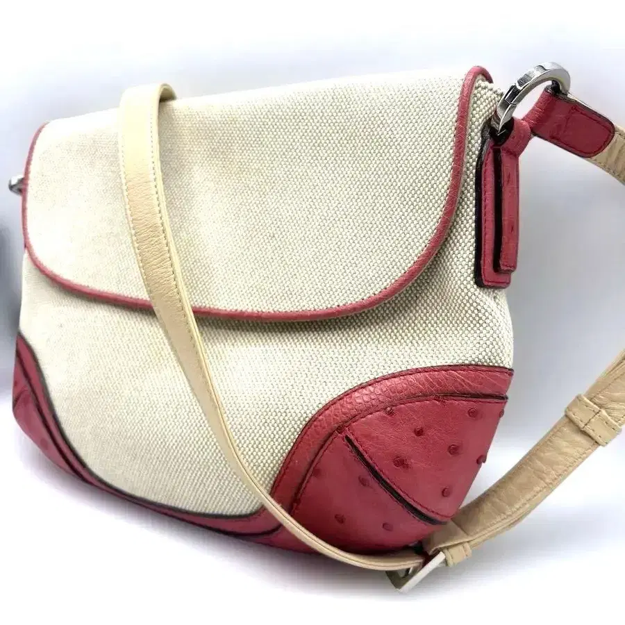 자동 번역되었어요. 원문보기크림색과 빨간색 캔버스와 가죽 숄더백, 조절 가능한 스트랩 포함.