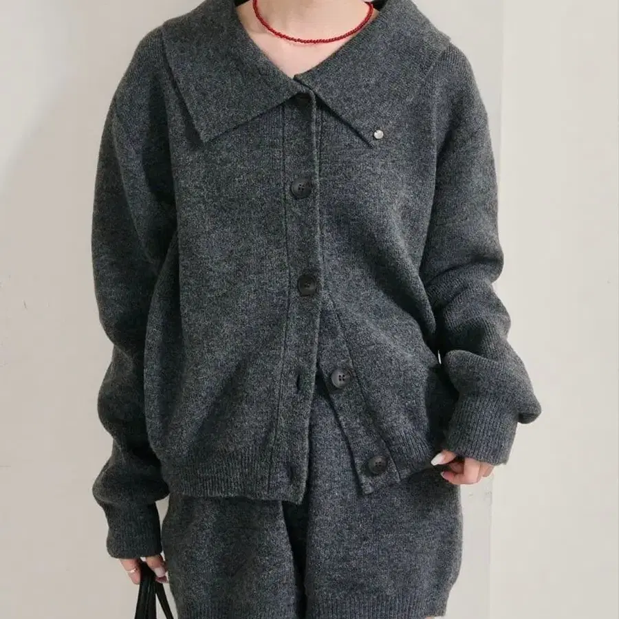 mystic 카라 부착 플레이트 니트 가디건 그레이