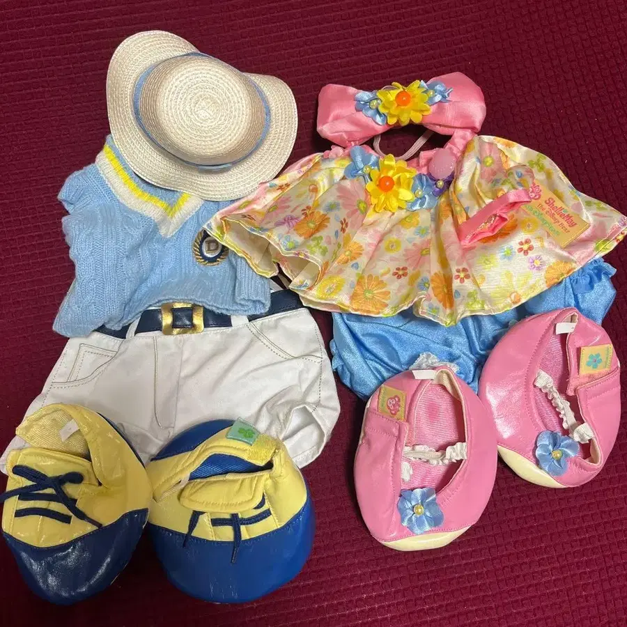 자동 번역되었어요. 원문보기더피 셰리메이 컬러풀한 꽃무늬 상의와 스트로우 햇이 특징인 봉제 인형용 옷 갈아입기 세트.