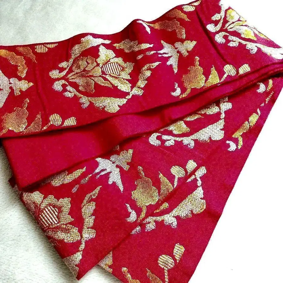 빨간색과 금실 자수가 화려한 반폭 오비입니다.