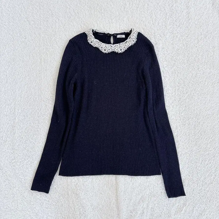 넥라인에 리버 레이스가 달린 컴팩트한 실루엣의 니트입니다. 적당한 핏감으로 부드러운 짜임입니다.