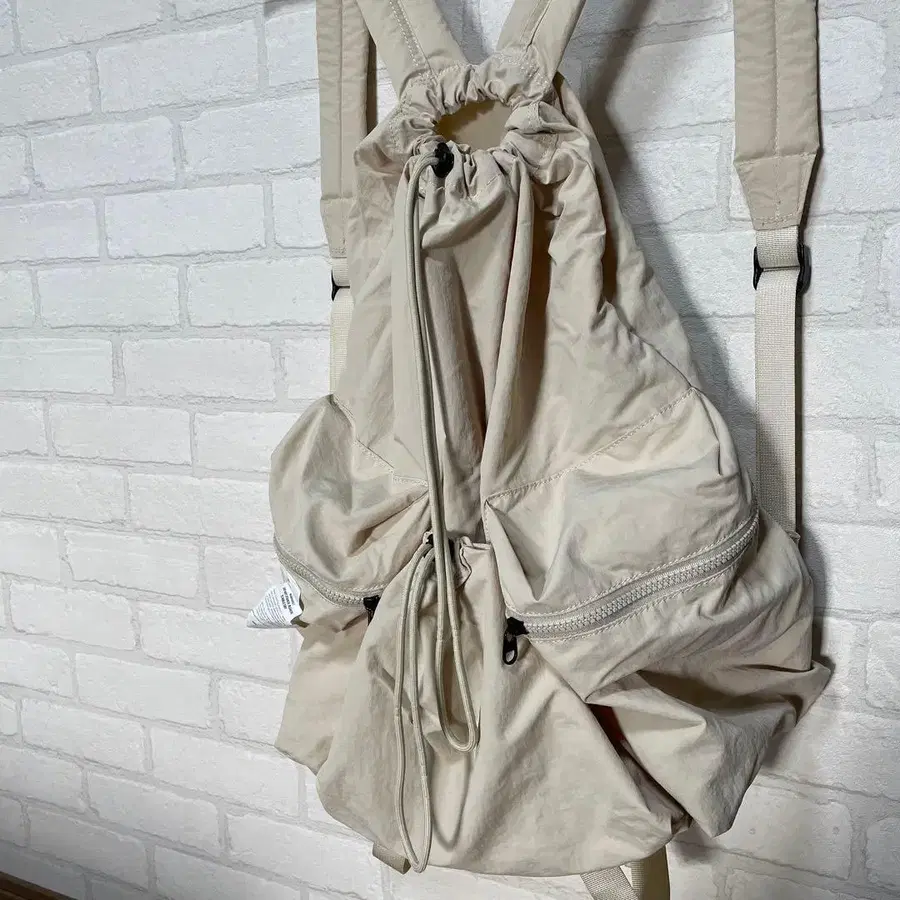 베이지 나일론 드로우 스트링 백팩