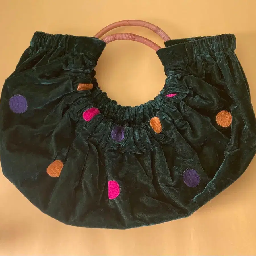 우드 핸들 다크 그린 벨벳 도트 무늬 핸드백