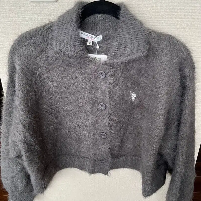 U.S. POLO ASSN 카라 부착 샤기 볼륨 슬리브 니트 차콜