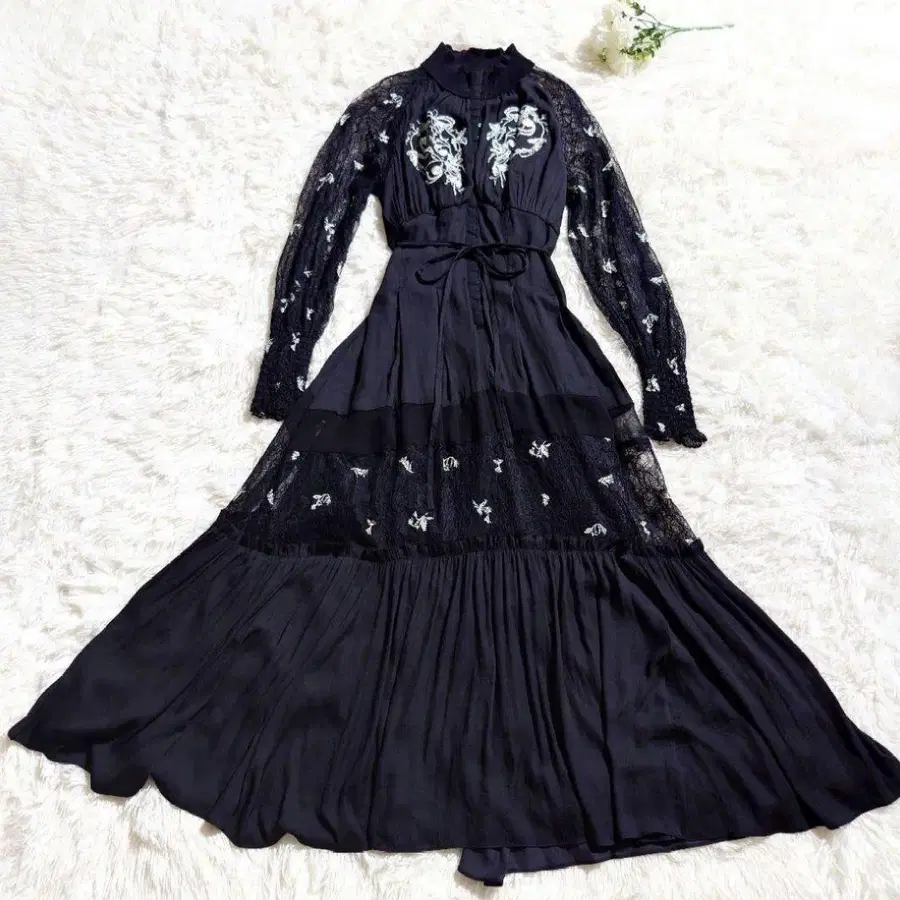 SNIDEL 스나이델 자수 롱 원피스 긴팔 원피스 블랙 레이스 꽃무늬 자수 맥시 길이 절개 드레스
