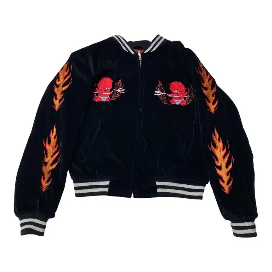 초심자도 입기 쉬운 캐주얼 스타일 수베니어 자켓입니다. 블랙 컬러에 등 부분에 대담한 '데빌' 모티브 자수가 들어간 것이 특징이며, 너무 화려하지 않고 적당한 존재감이 있습니다. 안감 원단은 레드 컬러의 퀼팅 디자인으로 인기 있는 조합의 컬러입니다.