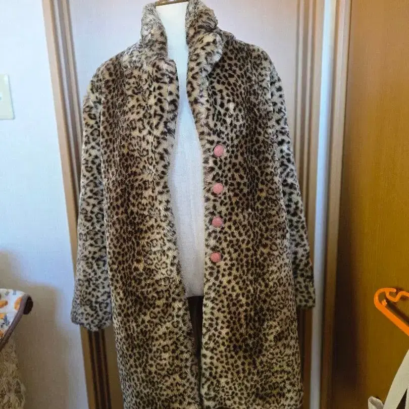 레오파드 무늬 퍼 롱 코트