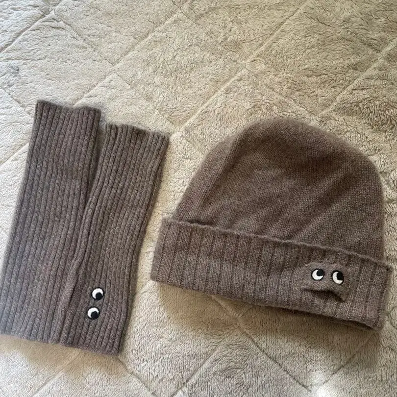 유니클로 ANYA HINDMARCH 니트 모자와 암워머 세트 브라운
