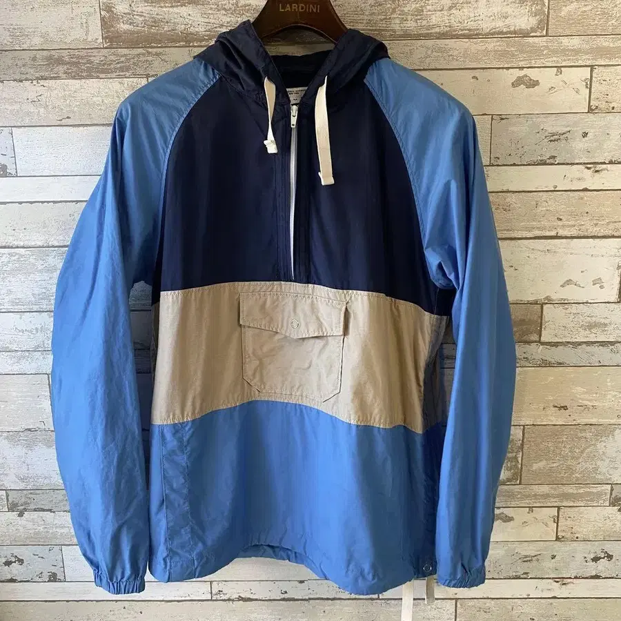 방문해 주셔서 감사합니다. 엔지니어드 가먼츠의 아노락 후드티입니다. 3가지 색상 절개 디자인으로, 왼쪽 사이드 지퍼가 겨드랑이까지 달려있는 디자인입니다. 자세한 내용은 아래와 같습니다. [브랜드] 엔지니어드 가먼츠 [생산국] 미국 [원단] 면 70% 나일론 30% [색상] 네이비 계열 x 스카이블루 계열 x 베이지 계열 실내에서 촬영하였으므로, 자연광과 색감이 조금 다를 수 있습니다. [사이즈 표기] M [실측치수] 화장 약 88.5cm, 가슴 너비 약 56cm, 기장 약 71.5cm입니다. 가슴 너비는 평평하게 놓은 뒷면을 측정하였습니다. [상태] (B-C) 약간의 희미한 오염 등 사용감이 있지만, 착용에 지장을 주는 데미지 등은 없습니다. 상태에 대한 자세한 내용은 아래와 같습니다. (N) 미사용품 새상품 데드스탁 (S) 컨디션 최상 (A) 새상품급 (B) 약간의 사용감은 있지만 눈에 띄는 흠집이나 얼룩은 없음 (C) 약간의 흠집이나 얼룩 등이 있음 (D) 흠집이나 얼룩이 있음 (E) 착용에 지장을 주는 데미지가 있음 그 외 궁금한 점이 있으시면 질문해 주세요.