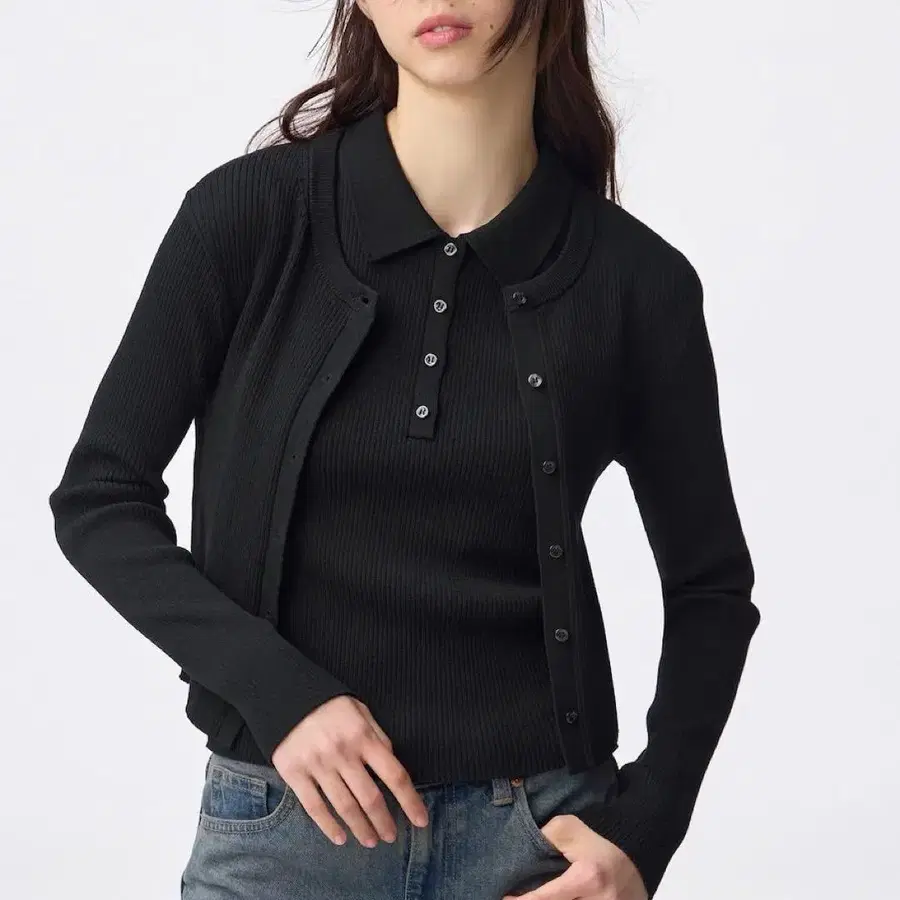 GU 2피스 리브 니트 피케 셔츠 L 블랙