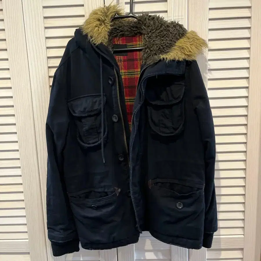 블랙 데미지 가공 퍼 포함 모즈 코트