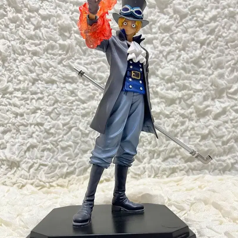 불꽃 이펙트가 특징인 사보의 피규어. - 캐릭터명: SABO - 피규어 포즈: 한 손을 올린 포즈 - 의상 색상: 그레이와 파랑 - 액세서리: 불꽃 이펙트 - 베이스 디자인: 검은색 베이스에 캐릭터명 플레이트 방문해 주셔서 감사합니다.